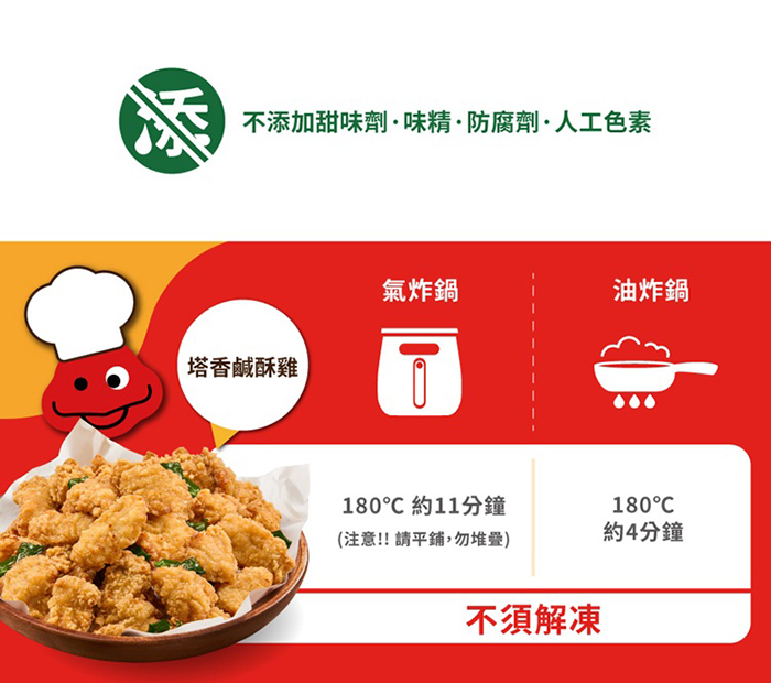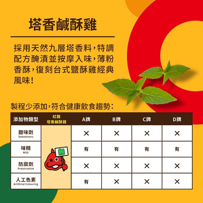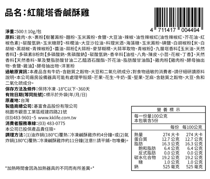 | 包裝內容/商品規格 | 紅龍塔香鹹酥雞(500±10g/包) |