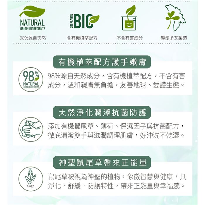 天然淨化潤澤抗菌防護:添加有機鼠尾草、薄荷、保濕因子與抗菌配方,徹底清潔雙手與滋潤調理肌膚,好沖洗不乾澀。