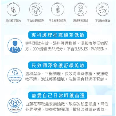 專科護理推薦植萃低敏:專科測試有效、婦科護理推薦,溫和植萃低敏配方,90%源自天然成分,不含SLS/SLES、PARABEN。