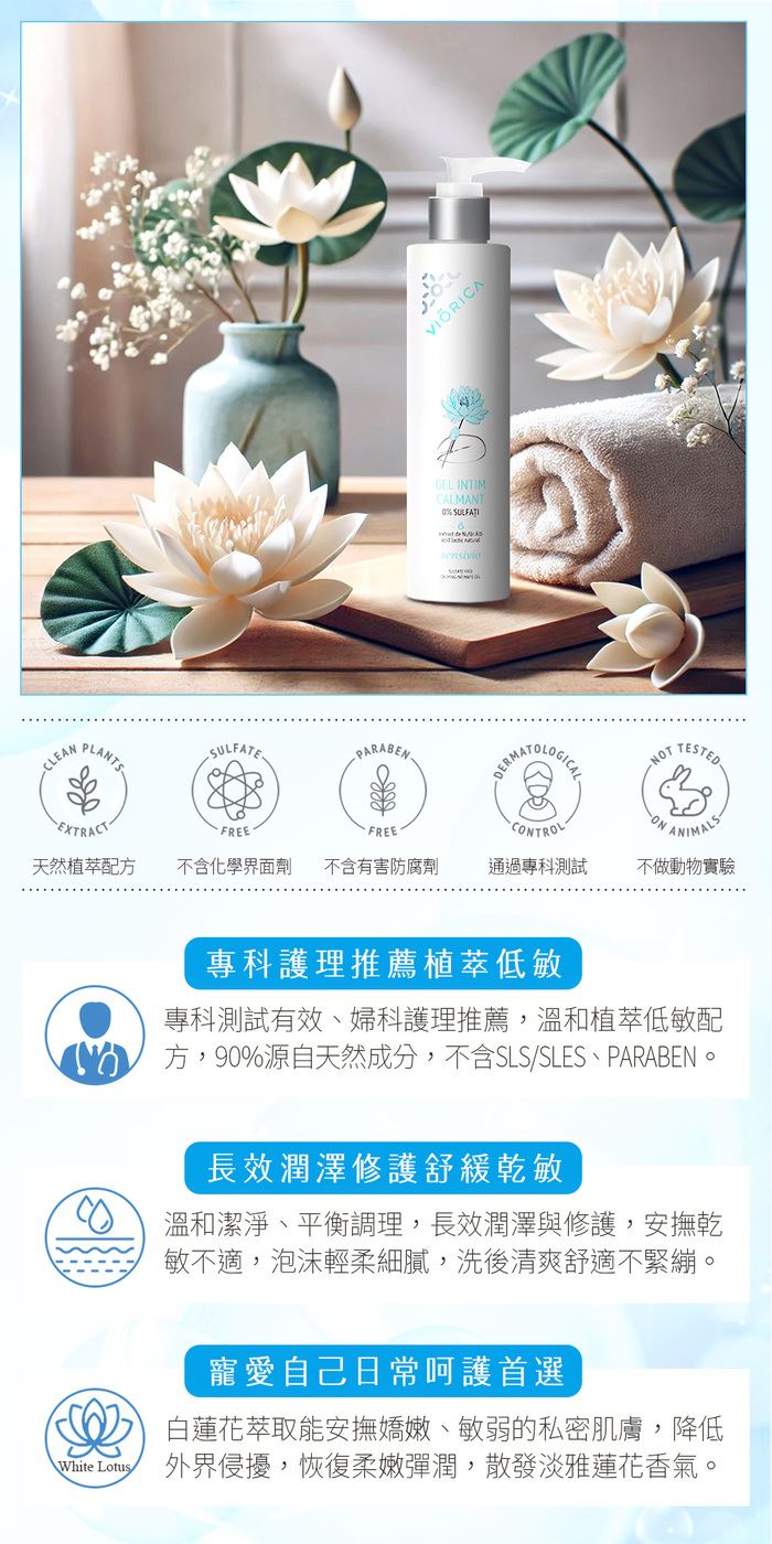 寵愛自己日常呵護首選:白蓮花萃取能安撫嬌嫩、敏弱的私密肌膚,降低外界侵擾,恢復柔嫩彈潤,散發淡雅蓮花香氣。