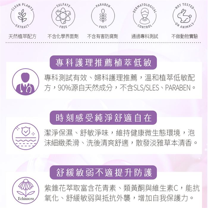 專科護理推薦植萃低敏:專科測試有效、婦科護理推薦,溫和植萃低敏配方,90%源自天然成分,不含SLS/SLES、PARABEN。