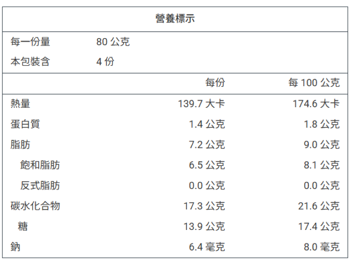 | 包裝內容/商品規格 | 80±4.5公克X4 |
