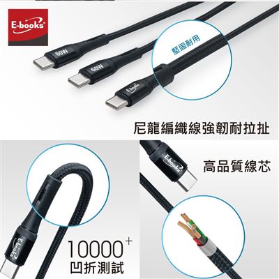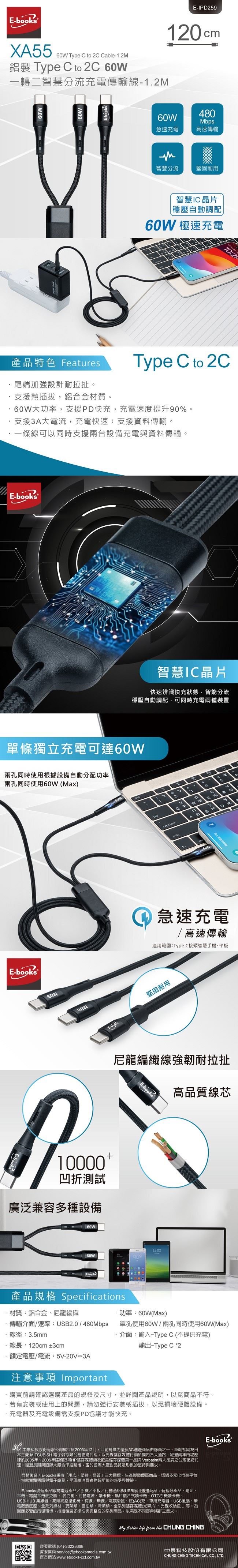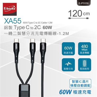 | 【商品名稱】 | E-books XA55 鋁製Type C to 2C 60W 一轉二智慧分流充電傳輸線-1.2M |