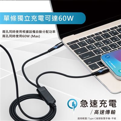 E-books XA55 鋁製Type C to 2C 60W 一轉二智慧分流充電傳輸線-1.2M3