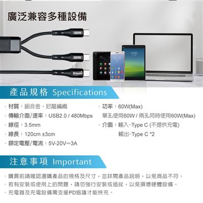 E-books XA55 鋁製Type C to 2C 60W 一轉二智慧分流充電傳輸線-1.2M