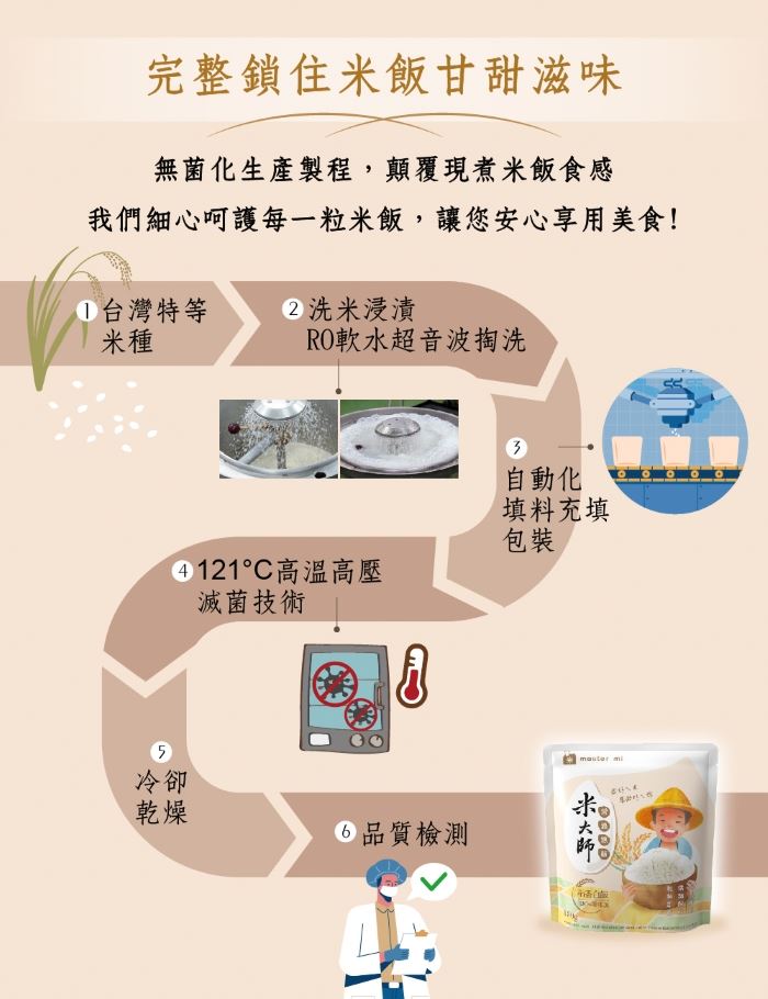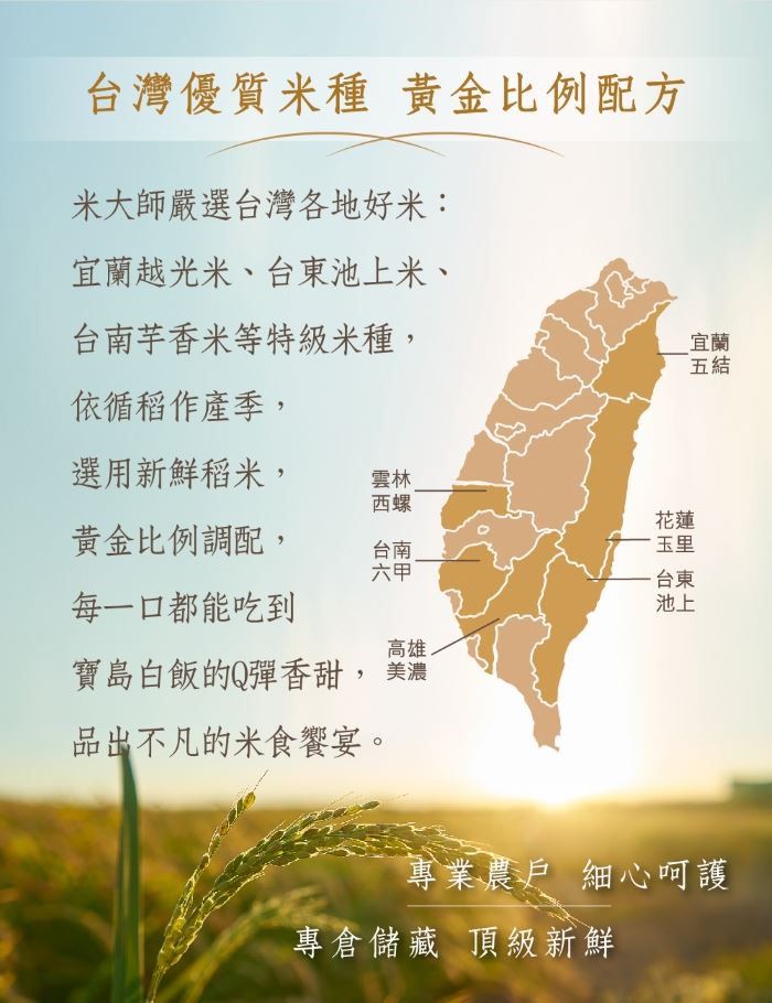米大師嚴選台灣各地好米:宜蘭越光米、台東池上米、台南芋香米等特級米種,依循稻作產季,選用新鮮稻米,黃金比例調配,每一口都能吃到寶島白飯的Q彈香甜,品出不凡的米食饗宴!