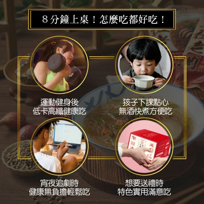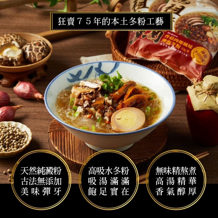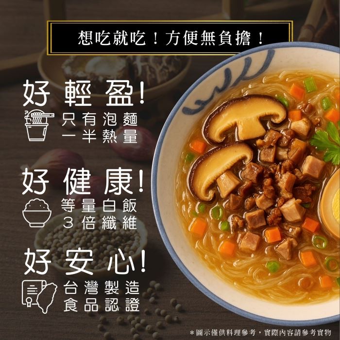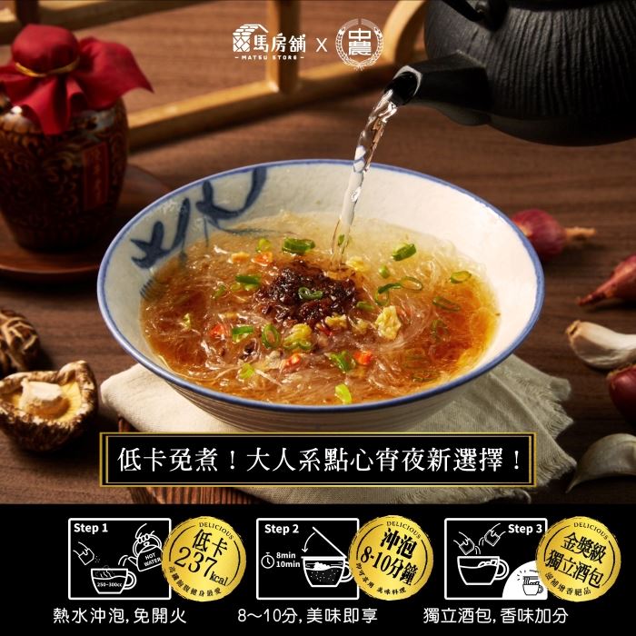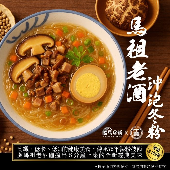 🥢超方便 !只要沖泡5-10分鐘 🥢超輕盈!只有泡麵一半的熱量 🥢好健康!等量白飯的3倍纖維 🥢超安心!台灣製造有食品認證 【馬祖老酒沖泡冬粉】香菇肉燥風味 高纖、低卡、低GI的健康美食,傳承75年製粉技術與馬祖老酒碰撞出8分鐘上桌的全新經典美味,馬祖酒廠純正釀造、鉑金獎同等級老酒、糯米紅麴多年純釀、白飯3倍膳食纖維、超低G1值僅有32、慢速升糖超健康、增量30%健康美味又飽腹。