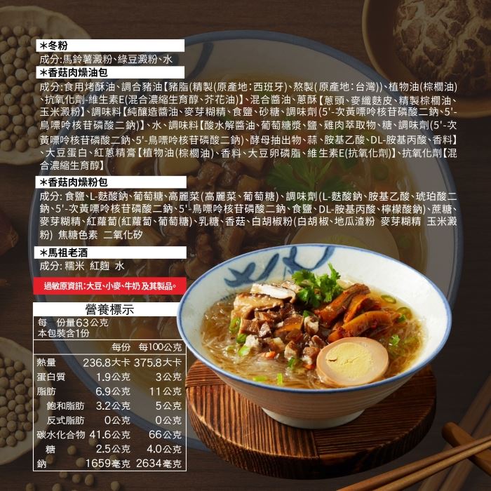 ▲冬粉成分:馬鈴薯澱粉、綠豆澱粉、水。 ▲香菇肉燥油包成分:食用烤酥油、調合豬油【猪脂(精製(原產地:西班牙)、熬製(原產地:台灣)、植物油(棕櫚油)、抗氧化劑-維生素E(混合濃縮生育醇、芥花油)】、混合醬油、蔥酥【蔥頭、麥纖麸皮、精製棕櫚油、玉米澱粉】、調味料【純釀造醬油、麥芽糊精、食鹽、砂糖、調味劑(5"-次黃嘌呤核苷磷酸二鈉、5"-鳥嘌呤核苷磷酸二鈉)】、水、調味料【酸水解醬油、葡萄糖漿、鹽、雞肉萃取物、糖、調味劑(5"-次黃嘌吟核苷磷酸二鈉、5"-鳥嘌呤核昔磷酸二鈉)、酵母抽出物、蒜、胺基乙酸、DL-胺基丙酸、香料】、大豆蛋白、紅蔥精膏【植物油(棕櫚油)、香料、大豆卵磷脂、維生素E(抗氧化劑)】、抗氧化劑【混合濃縮生育醇】 ▲香菇肉燥粉包成分:食鹽、L-麩酸納、葡萄糖、高麗菜(高麗菜、葡萄糖)、調味劑(L-麩酸鈉、胺基乙酸、琥珀酸二鈉、5"-次黃嘌吟核磷酸二鈉、5"-鳥嘌呤核苷磷酸二鈉、食鹽、DL-胺基丙酸、檸檬酸鈉)、蔗糖、麥芽糊精、紅蘿蔔(紅蘿蔔、葡萄糖)、乳糖、香菇、白胡椒椒粉(白胡椒、地瓜渣粉、麥芽糊精、玉米澱粉)、焦糖色素、二氧化矽 ▲馬祖老酒成分:糯米、紅麹、水 |