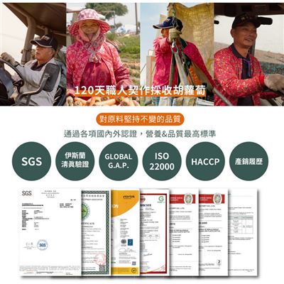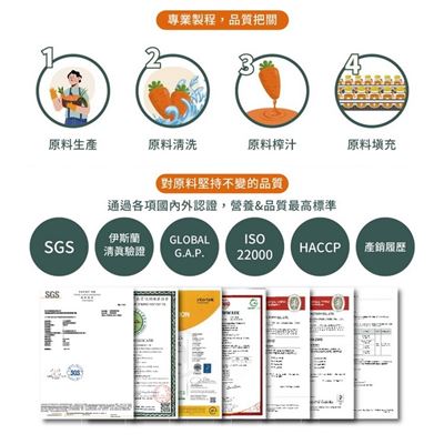 | 內容物(完整成份/食品添加物) | 全果胡蘿蔔原汁、水、白葡萄濃縮汁、柳橙濃縮汁、檸檬濃縮汁、鳳梨濃縮汁 |