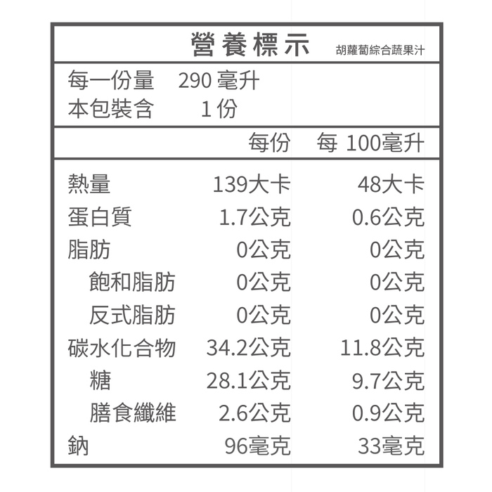 | 商品名稱 | 胡蘿蔔綜合蔬果汁 |