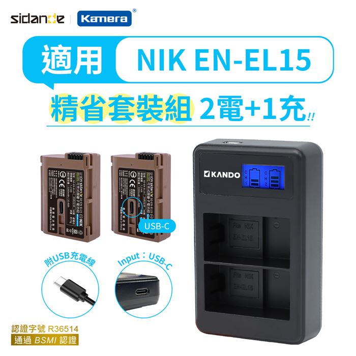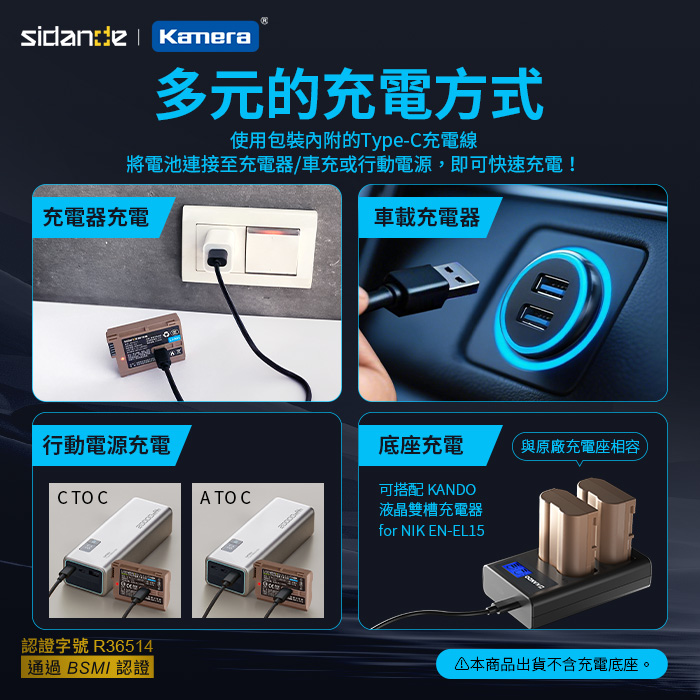 - 底座充電模式-搭配 KANDO 液晶雙槽充電器 for NIK EN-EL15,可一次為兩顆電池充電,讓充電更靈活