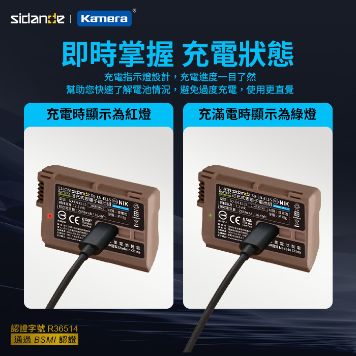 - 充電指示燈設計,避免過度充電,讓您輕鬆掌握充電進度,拍攝旅程中的最佳伴侶