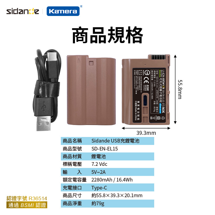 Sidande SD-EN-EL15 USB充電式鋰電池 |