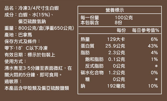 | 內容物(完整成份/食品添加物) | 白蝦、水、偏亞硫酸氫鈉。過敏原:甲殼類.偏亞硫酸鹽類。如圖所示(依實際到貨外包裝為主) |