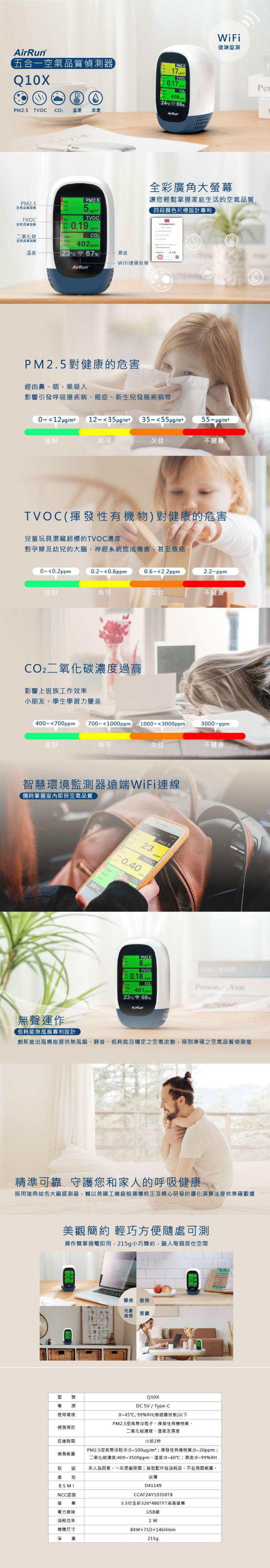 | 商品名稱 | AirRun 五合一空氣品質偵測器 Q10X (Wifi遠端監控、MIT台灣研發製造) |