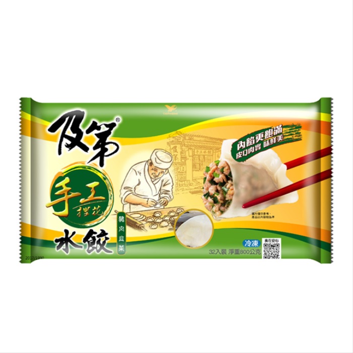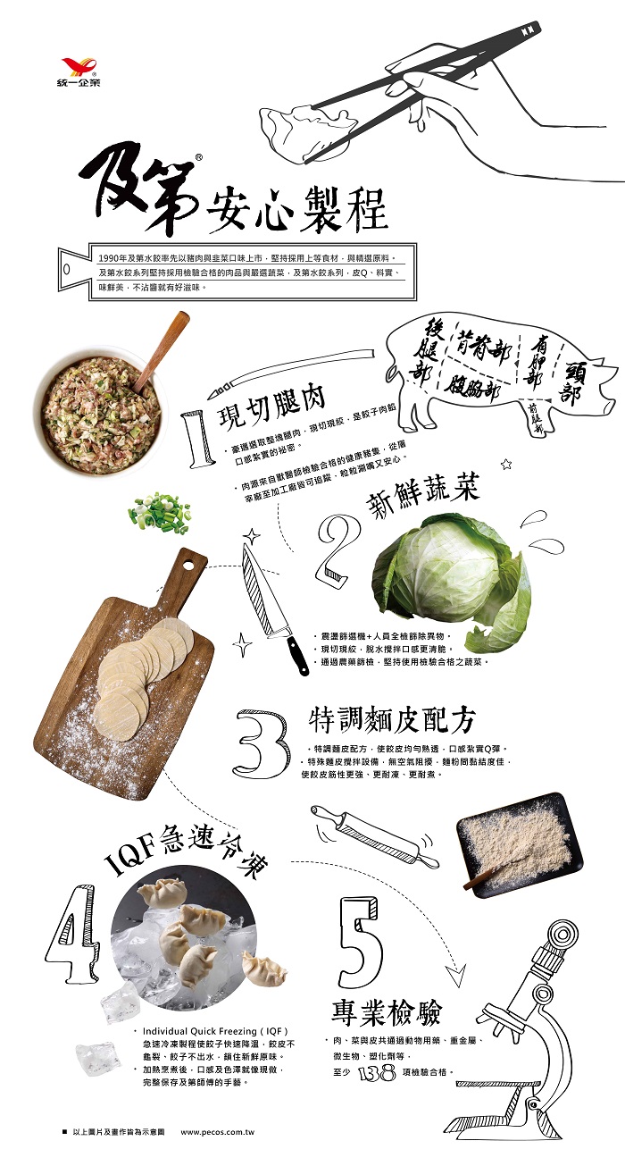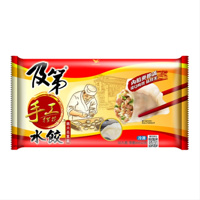 1990年及第水餃率先以豬肉與韭菜口味上市,及第堅持採用檢驗合格豬肉、嚴選蔬菜與精選食材,打造品牌「皮Q、肉實、味鮮美」的卓越品質,不沾醬就有好滋味。