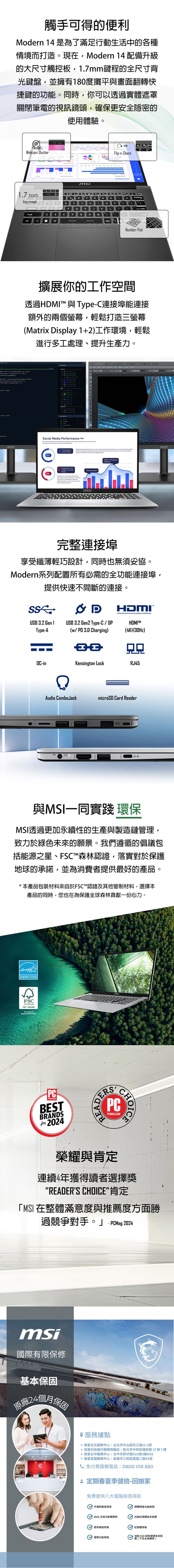 | 【商品名稱或型號】 | MSI微星 Modern 14 H F13MG-044TW 14吋輕薄商用筆電(i3-1315U/8G/512G SSD/Win11) |