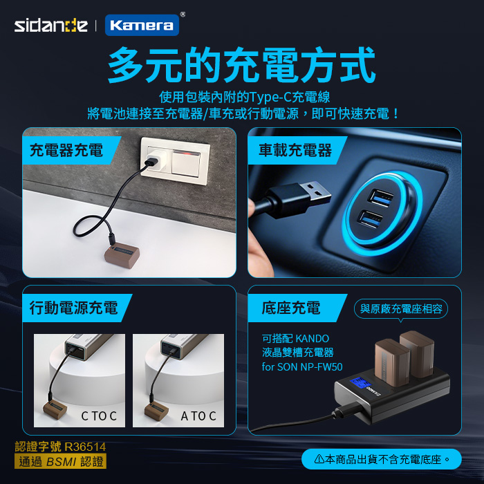 - 底座充電模式-搭配 KANDO 液晶雙槽充電器 for NP-FW50,可一次為兩顆電池充電,讓充電更靈活