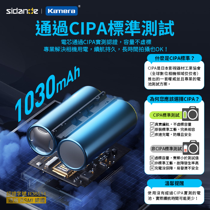 - 本商品經由CIPA標準測試,品質經過專業驗證,擁有卓越的續航力,提供您安心使用的保障
