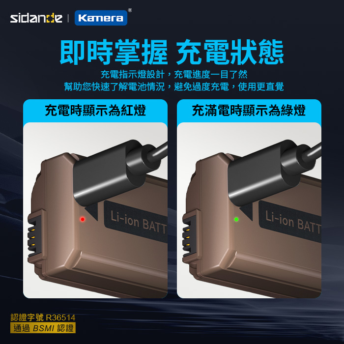 - 充電指示燈設計,避免過度充電,讓您輕鬆掌握充電進度,拍攝旅程中的最佳伴侶