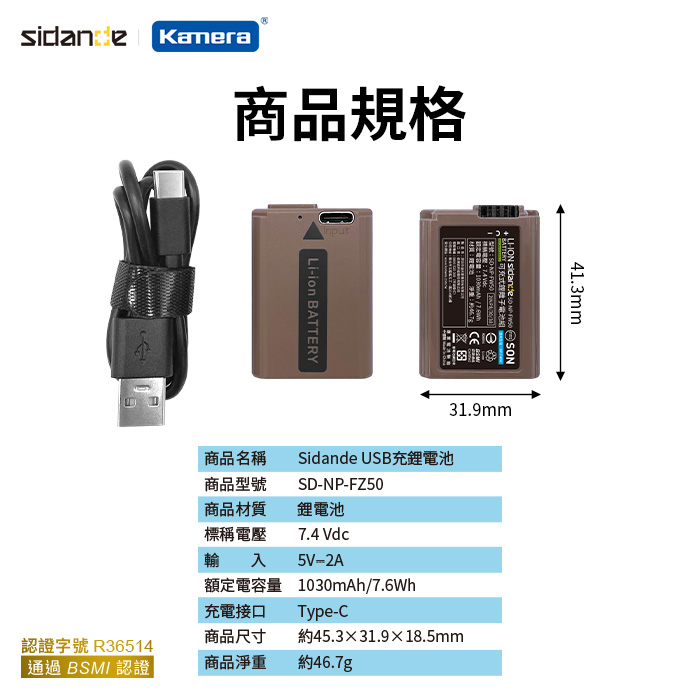 Sidande SD-NP-FW50 USB充電式鋰電池 |