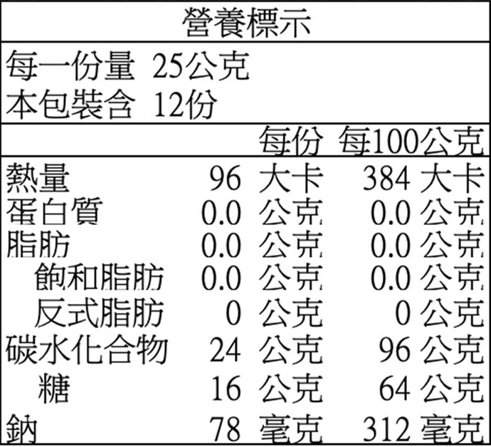 | 營養標示 | 如圖片所示,此營養標示數據依台灣法規為基礎。 |