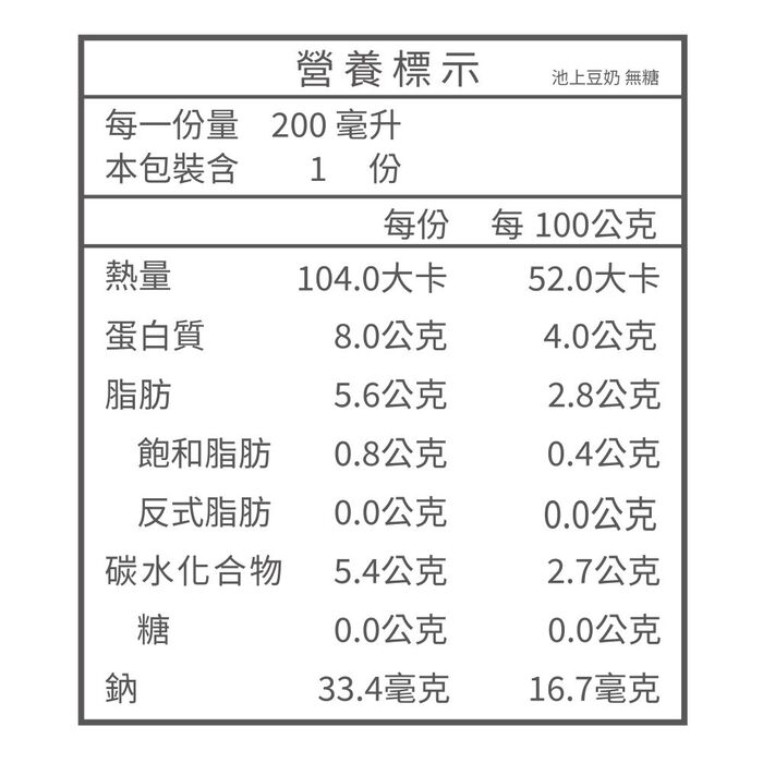 本產品含有大豆,不適合對其過敏體質者食用。本產線亦生產含牛乳、羊乳、芝麻、花生、麩質及其製品。 |