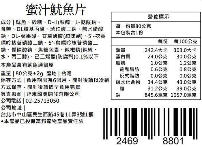 | 過敏原資訊 | 本產品含有魷魚製品 |
