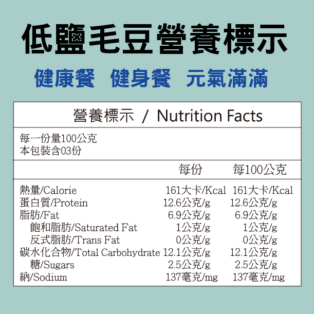 | 營養標示 | 熱量 161大卡、蛋白質12.6公克、脂肪6.9公克、飽和脂肪1公克、反式脂肪0公克、碳水化合物12.1公克、糖2.5公克、鈉137毫克 |
