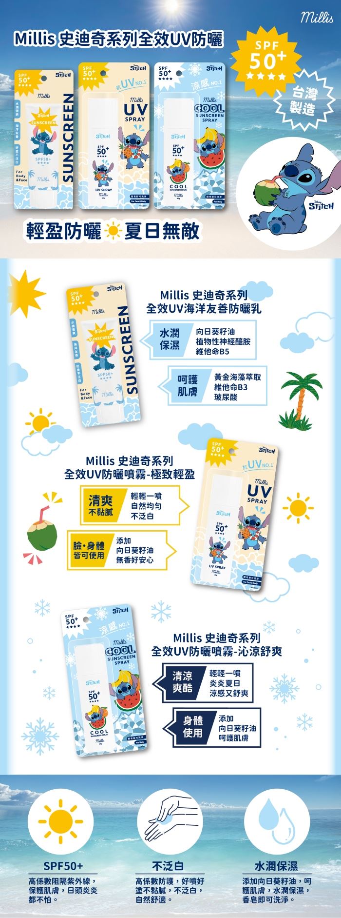 | 商品名稱/包裝內容規格 | Millis史迪奇系列防曬噴霧-極致輕盈60g |