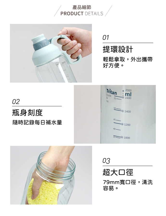 | 內容物 | 共2件組:運動瓶2000ml粉藍*1+運動瓶2000ml粉紫*1 |