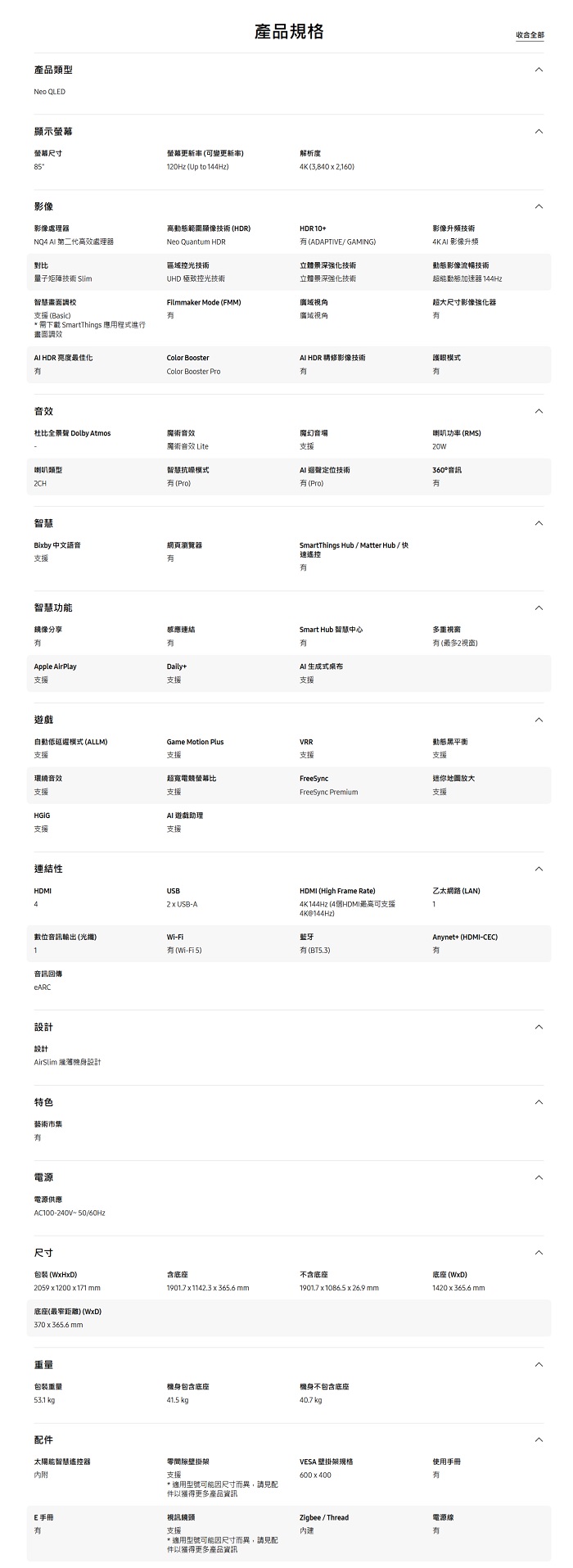 | 商品名稱 | Samsung Vision AI 85型 Neo QLED QN1EF 4K 智慧顯示器 (2025) |
