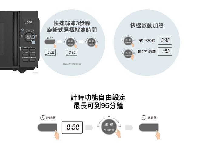 快速啟動:按 [啟動‧快速啟動] 鍵 : 800W 30秒,每次按下可增加30秒,最長為10分鐘
