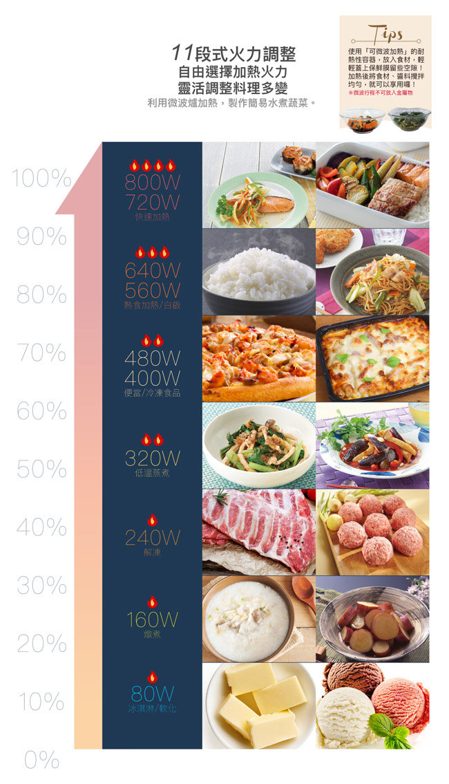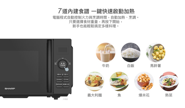 自動烹調:7種:爆米花、牛奶/咖啡、白飯、義大利麵、馬鈴薯、熱菜、魚