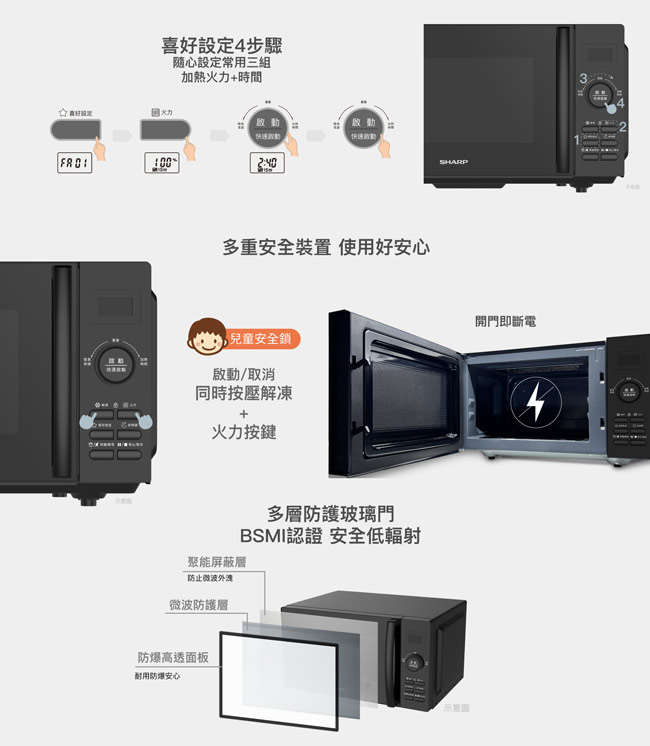 多段烹調:可兩段式烹調,設定第一段瓦數/時間+第二段瓦數/時間, 第一段烹調結束後會進行第二段設定烹調