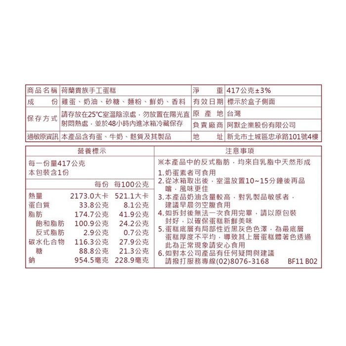 | 過敏原資訊 | 蛋、鮮奶、麩質及其製品。 | |