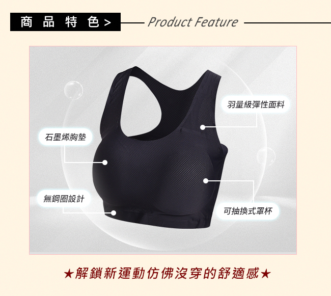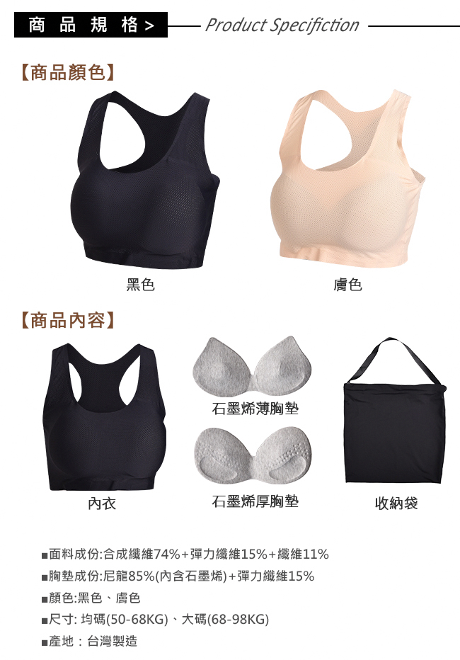 面料成份:合成纖維74%+彈力纖維15%+纖維11% 胸墊成份:尼龍85%(內含石墨烯)+彈力纖維15% |