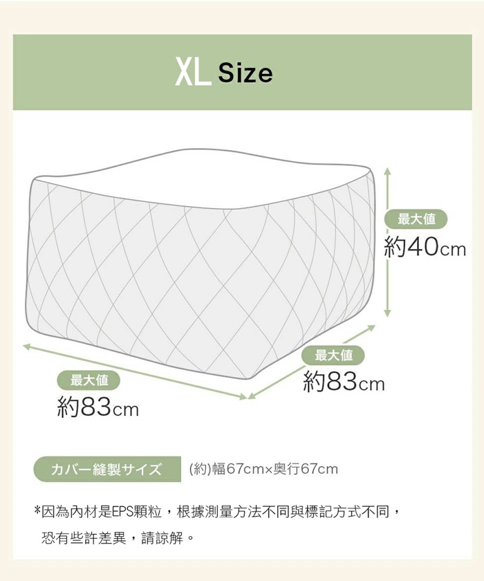 *因為內材是EPS顆粒,根據測量方法不同與標記方式不同,恐有些許差異,請諒解。 |