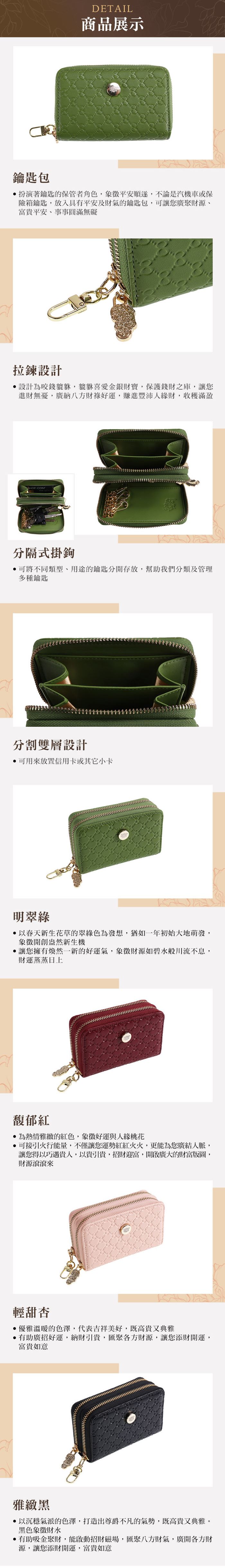 鑰匙包扮演著鑰匙的保管者角色,象徵平安順遂,不論是汽機車或保險箱鑰匙,放入具有平安及財氣的鑰匙包,可讓您廣聚財源、富貴平安、事事圓滿無礙!