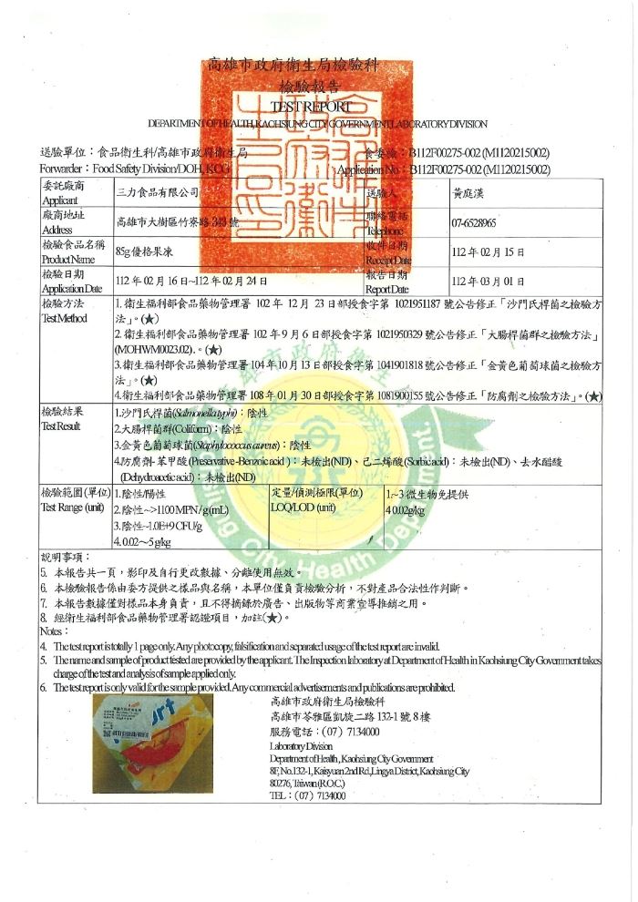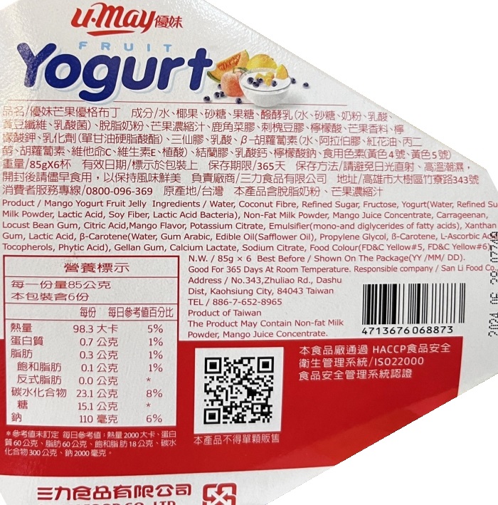 | 內容物(完整成份/食品添加物) | 水.椰果,砂糖.果糖.酸酵乳(水.砂糖,奶粉,乳酸,黄豆纖維.乳酸菌).脫脂奶粉.芒果濃縮汁,鹿角菜膠, 刺槐豆膠,檸檬酸,芒果香料.檸檬酸鉀.乳化劑(單甘油硬脂酸酯).三仙膠,乳酸.B-胡蘿蔔素(水,阿拉伯膠, 紅花油,丙二醇,胡蘿蔔素,維他命C,維他命E,植酸)結蘭膠,乳酸鈣.檸檬酸鈉,食用色素(黃色4號,黃色5號) |