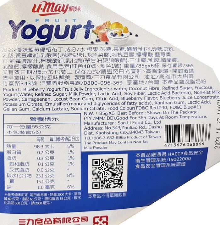 | 內容物(完整成份/食品添加物) | 水.椰果,砂糖.果糖.酸酵乳(水.砂糖,奶粉,乳酸,黄豆纖維.乳酸菌).脫脂奶粉.鹿角菜膠, 刺槐豆膠.檸檬酸,藍莓香料,藍莓濃縮汁.檸檬酸鉀.乳化劑(單甘油硬脂酸酯).三仙膠,乳酸. 結蘭膠乳酸鈣.檸檬酸鈉,食用色素(紅色40號、藍色1號) |
