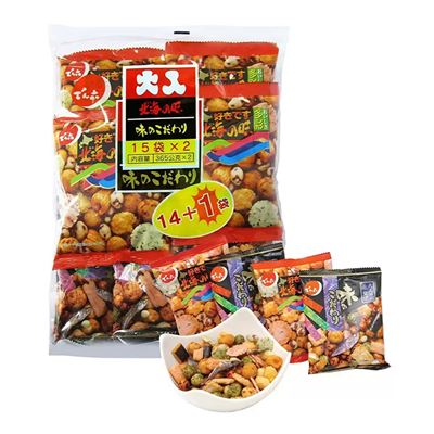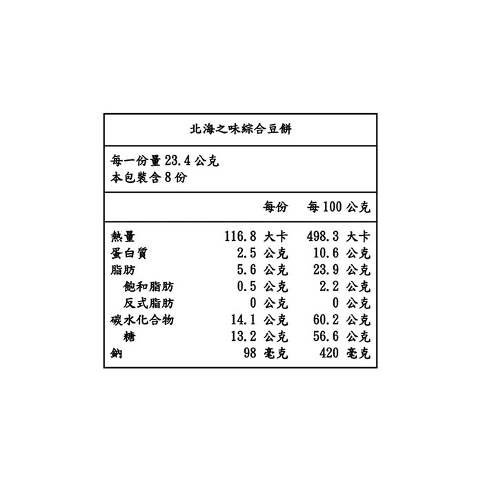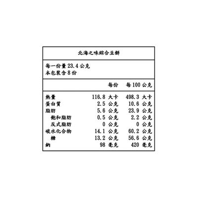北海之味綜合豆餅 : 花生, 植物油(玉米油, 油菜籽油, 棕櫚油, 米), 澱粉 (玉米澱粉, 馬鈴薯澱粉), 米, 小麥粉, 砂糖, 糯米粉, 糯米,馬鈴薯粉, 蝦, 食鹽, 醬油(脫脂加工大豆,小麥,食鹽,味精,葡萄糖,酒) 墨魚, 調味海膽 (海膽, 鹽, 糖), 蛋白加水分解物 (大豆, 玉米,食鹽), 雞肉粉(雞肉,食鹽,香菇), 南瓜, 奶油, 乳糖, 洋蔥粉, 酵母, 大蒜粉, 胡椒, 萵苣, 芝麻, 蟹, 海苔, 調味蟹肉 (蟹, 鹽, 小麥粉), 葡萄糖, 甘蔗, 蜂蜜, 鰹魚粉(食鹽,鰹魚), 膨脹劑 (碳酸氫銨), 味精, 天然色素 (黃梔子花色素, 胡蘿蔔素, 紅麴), 香料, 海藻糖, 檸檬酸, 糊料 (玉米澱粉, 馬鈴薯澱粉, 樹薯澱粉), 爋液香料, 香辛料 (芥菜籽粉), 甜味劑 (醋磺內酯鉀,D- 山梨醇)。