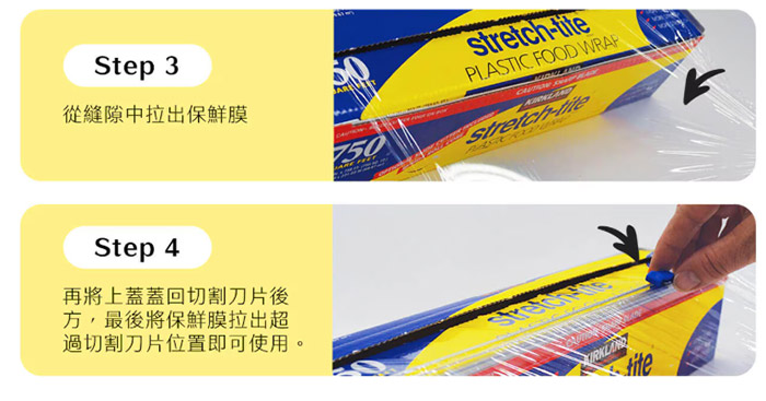 1. 使用固定式切割刀片:從OPEN HERE處開啟紙板並打開上蓋,沿上蓋中央虛線往內壓出一條縫隙,從縫隙中拉出保鮮膜,再將上蓋蓋回切割刀片後方,最後將保鮮膜拉出超過切割刀片位置即可使用。