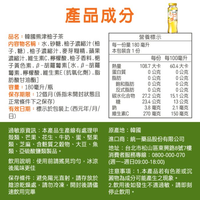 | 商品名稱 | (大智通箱購)韓國熊津柚子茶180ml*24瓶/箱 |