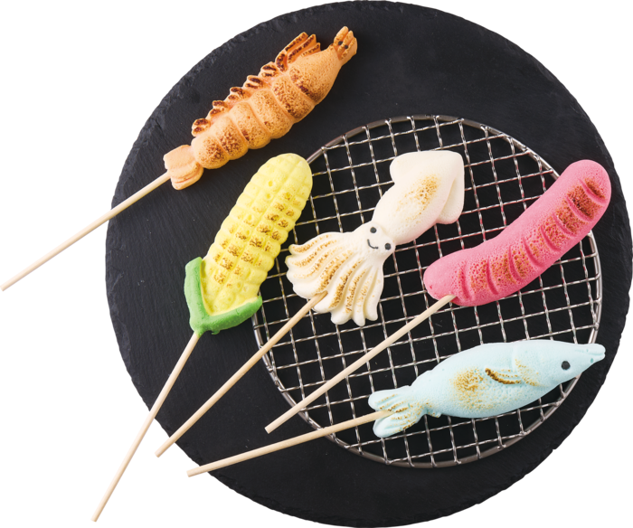 ※一改原本印象中白色圓圓的形狀,將棉花糖製作成蝦子、魚、玉米、魷魚和香腸的模樣,每一個吃起來還有芒果、葡萄、香蕉等水果風味~