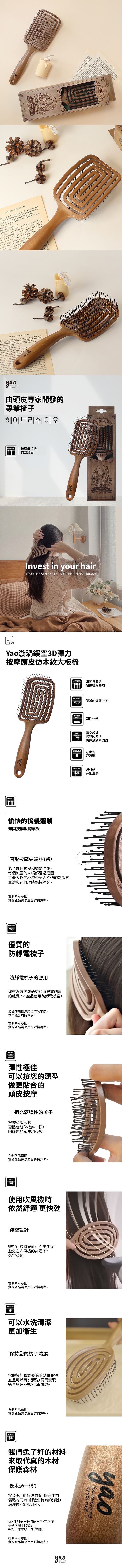 | 商品名稱/包裝內容規格 | YAO 漩渦鏤空3D彈力按摩頭皮仿木紋大板梳 |