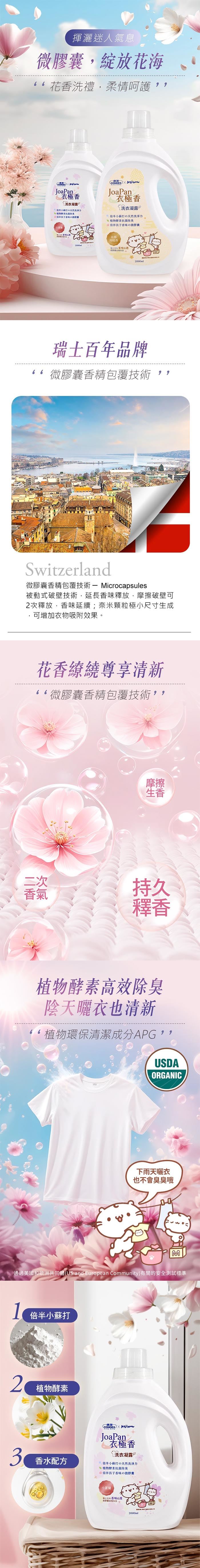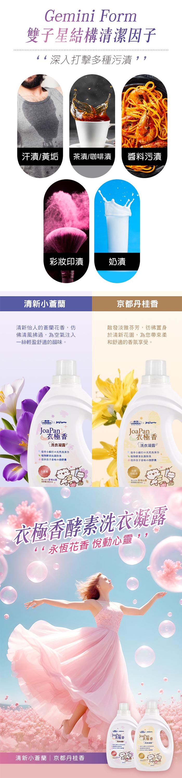 | 注意事項 | 1. 請保存在陰涼乾燥處並幼童不易取得處 2. 本產品不可食用,若誤食請飲用大量清水體內稀釋後送醫 3. 請勿與其他強鹼或強酸產品共同使用 4. 使用完畢蓋子需鎖緊避免香味散失 5. 請勿長時間與皮膚接觸,避免可能發生過敏 6. 微膠囊需要在衣物乾燥情況下才有擴香效果,請注意衣物需完全烘乾/曬乾,避免效果打折 |