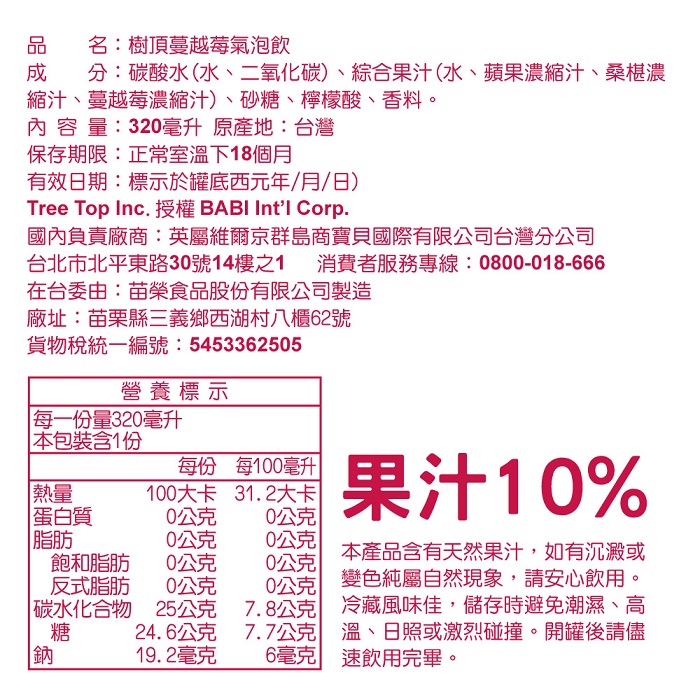 | 內容物(完整成份/食品添加物) | 碳酸水(水、二氧化碳)、綜合果汁(水、蘋果濃縮汁、桑椹濃縮汁、蔓越莓濃縮汁)、砂糖、檸檬酸、香料 |