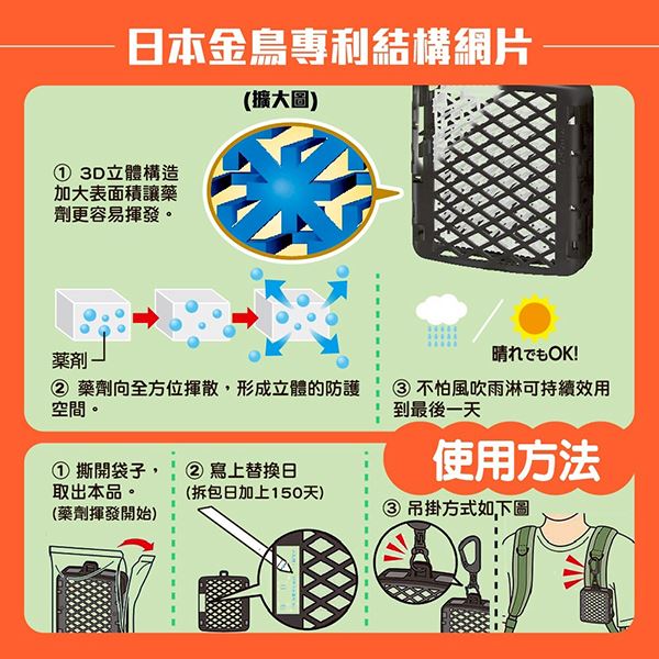 | 商品名稱 | 日本金鳥 室內外防蚊掛片150日-隨身款 |