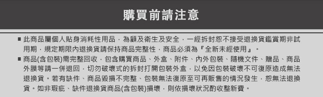 ★此商品屬個人貼身消耗性用品,為顧及衛生及安全,一經拆封恕不接受退換貨。 本產品不提供試用,7天「鑑賞期」非「試用期」。欲辦理退貨之商品必須是全新完整、未拆封之包裝狀態(含商品本體、贈品、原包裝袋、盒、箱、隨貨文件)。除非是商品瑕疵問題,拆封後無法辦理退貨。 |